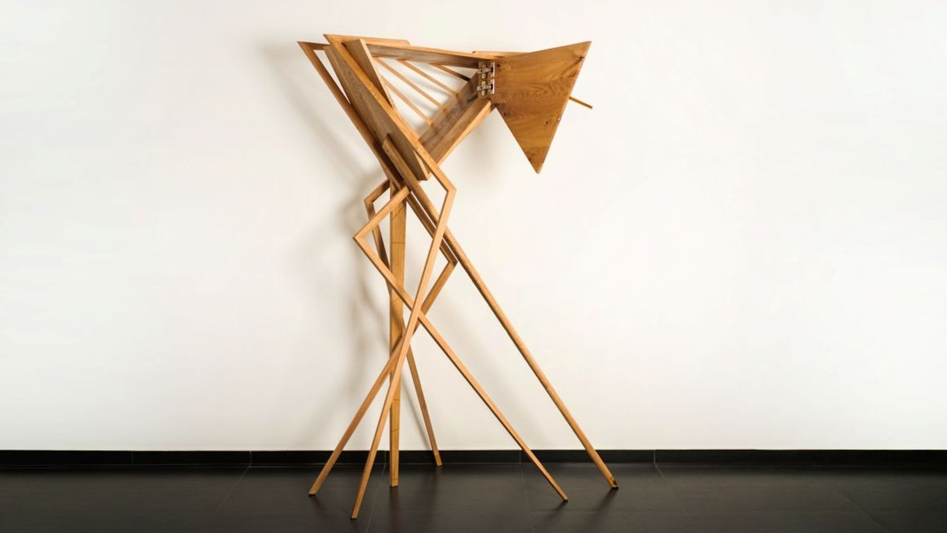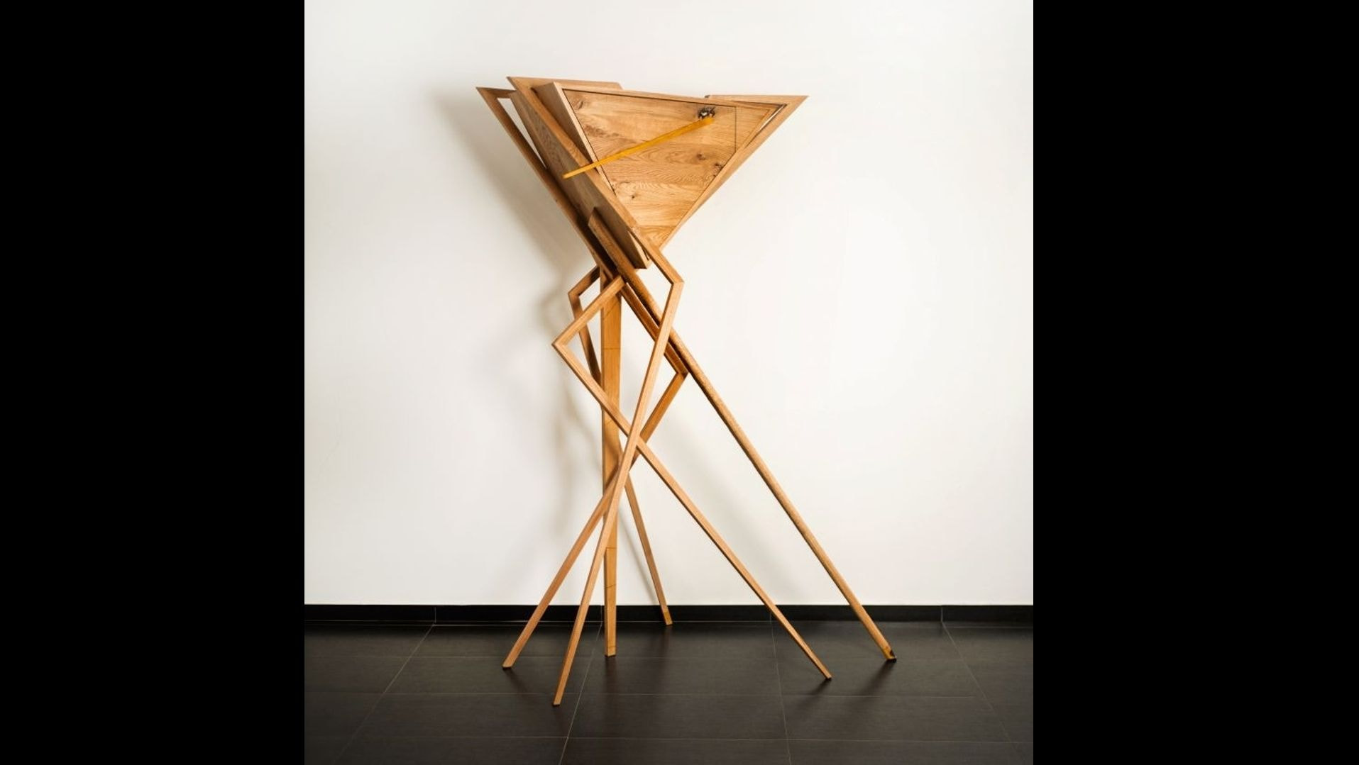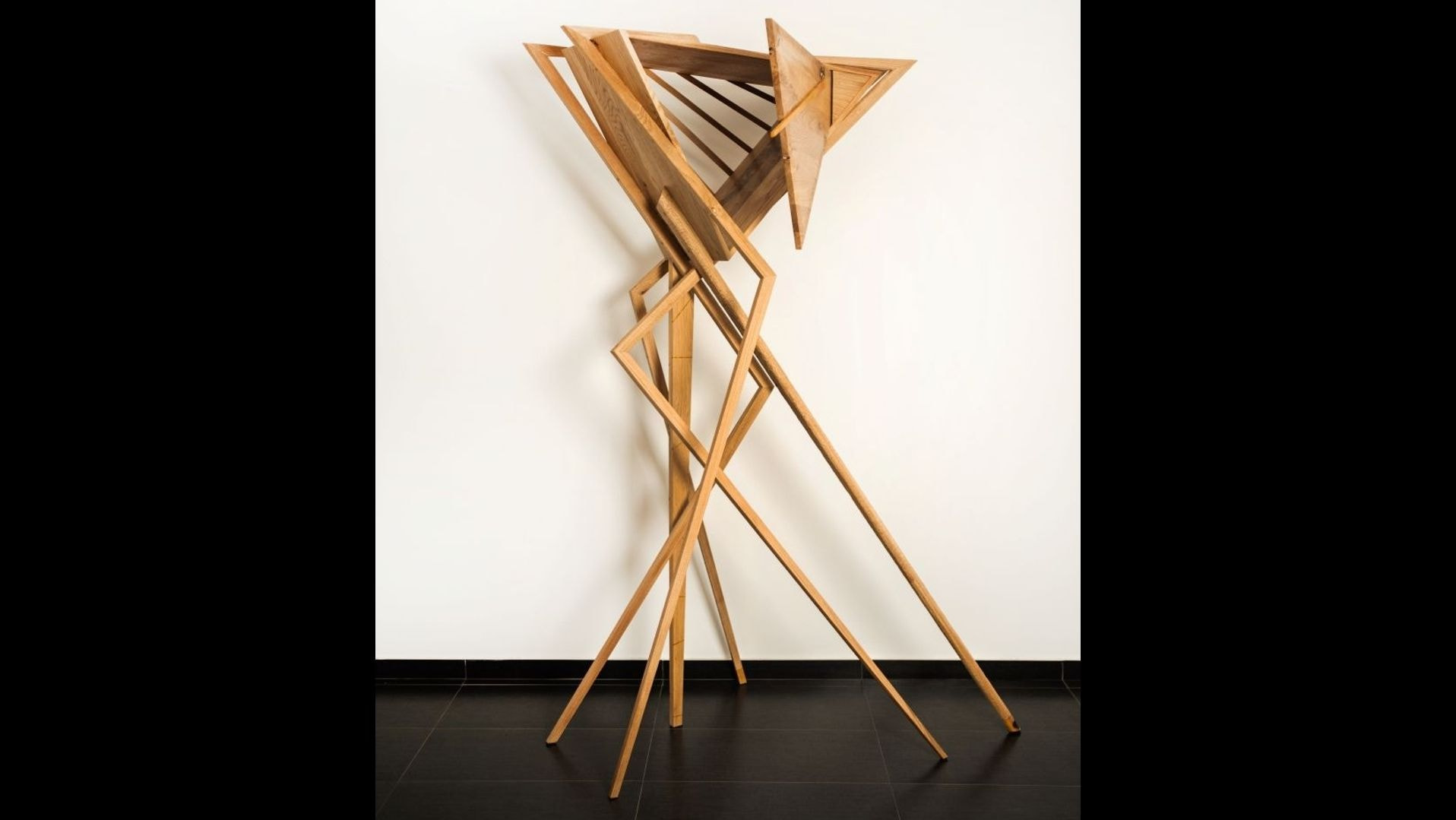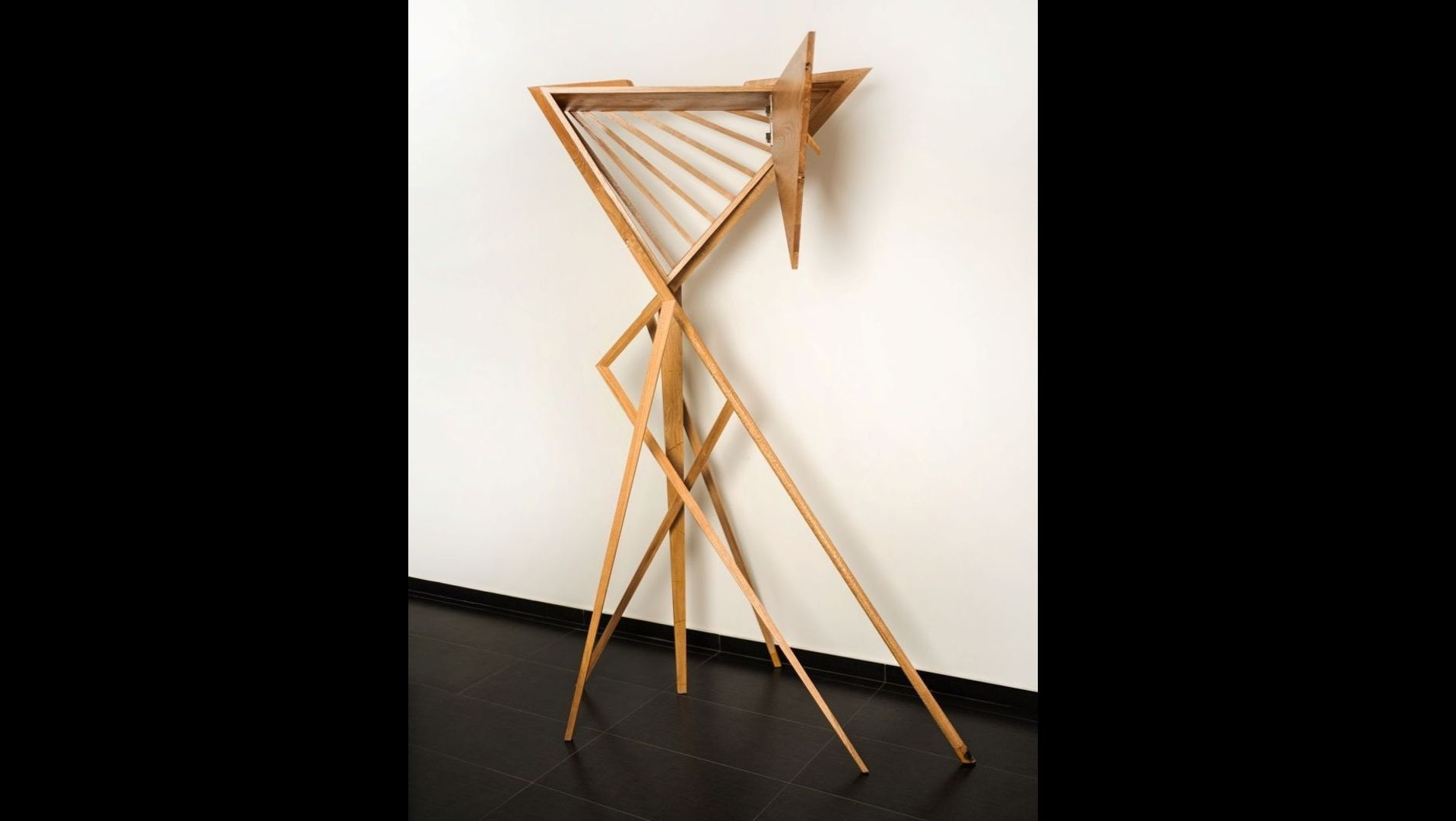 Iz tal se dviga na dolgih, lomljenih nogah, kot bitje v trenutku ravnotežja, razpeto med stabilnostjo in gibom. Njena trikotna silhueta se odpira in zapira, kakor napetost med notranjim prostorom in zunanjim pogledom.