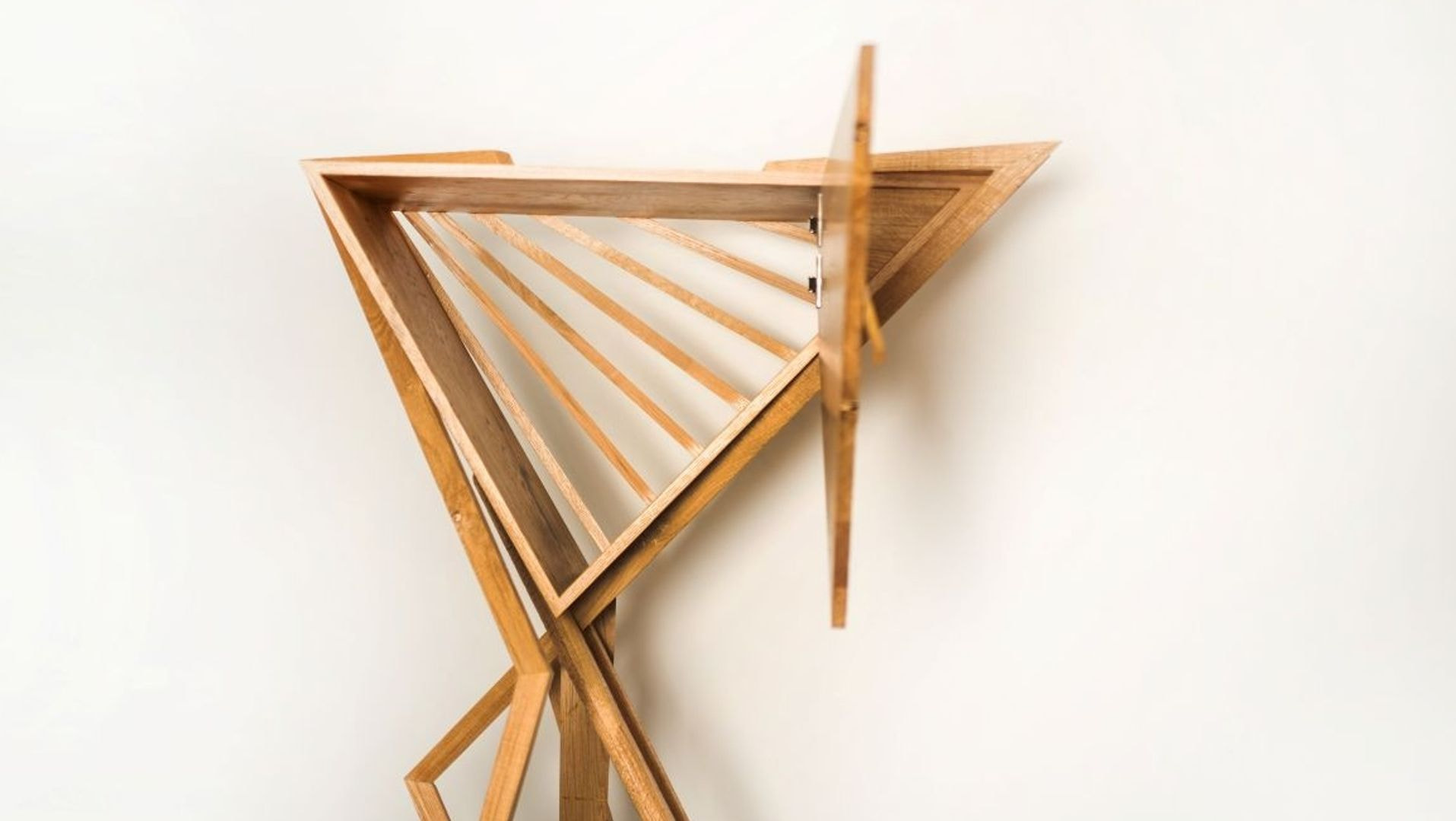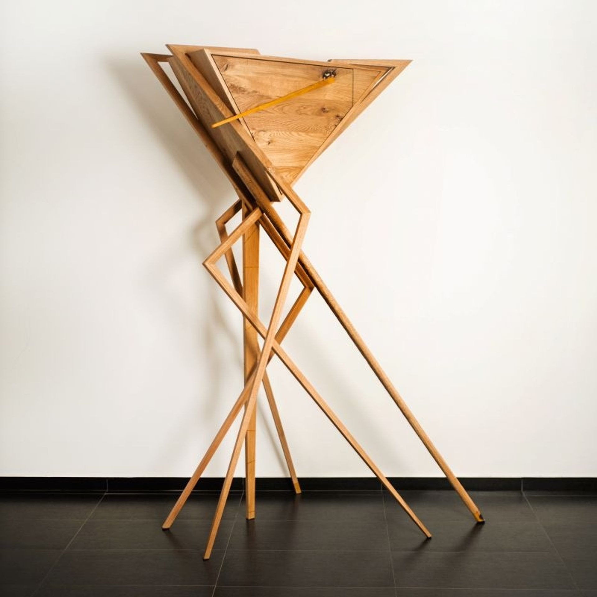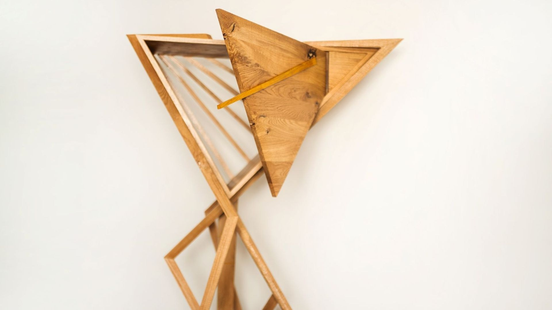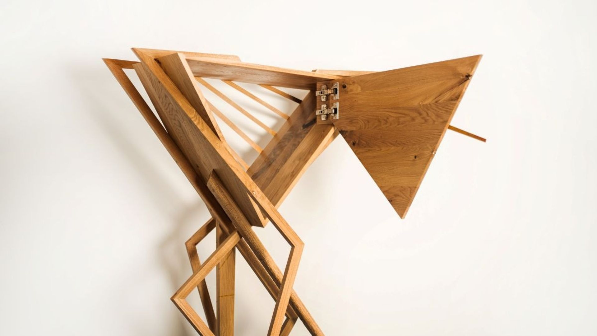 Iz tal se dviga na dolgih, lomljenih nogah, kot bitje v trenutku ravnotežja, razpeto med stabilnostjo in gibom. Njena trikotna silhueta se odpira in zapira, kakor napetost med notranjim prostorom in zunanjim pogledom.
